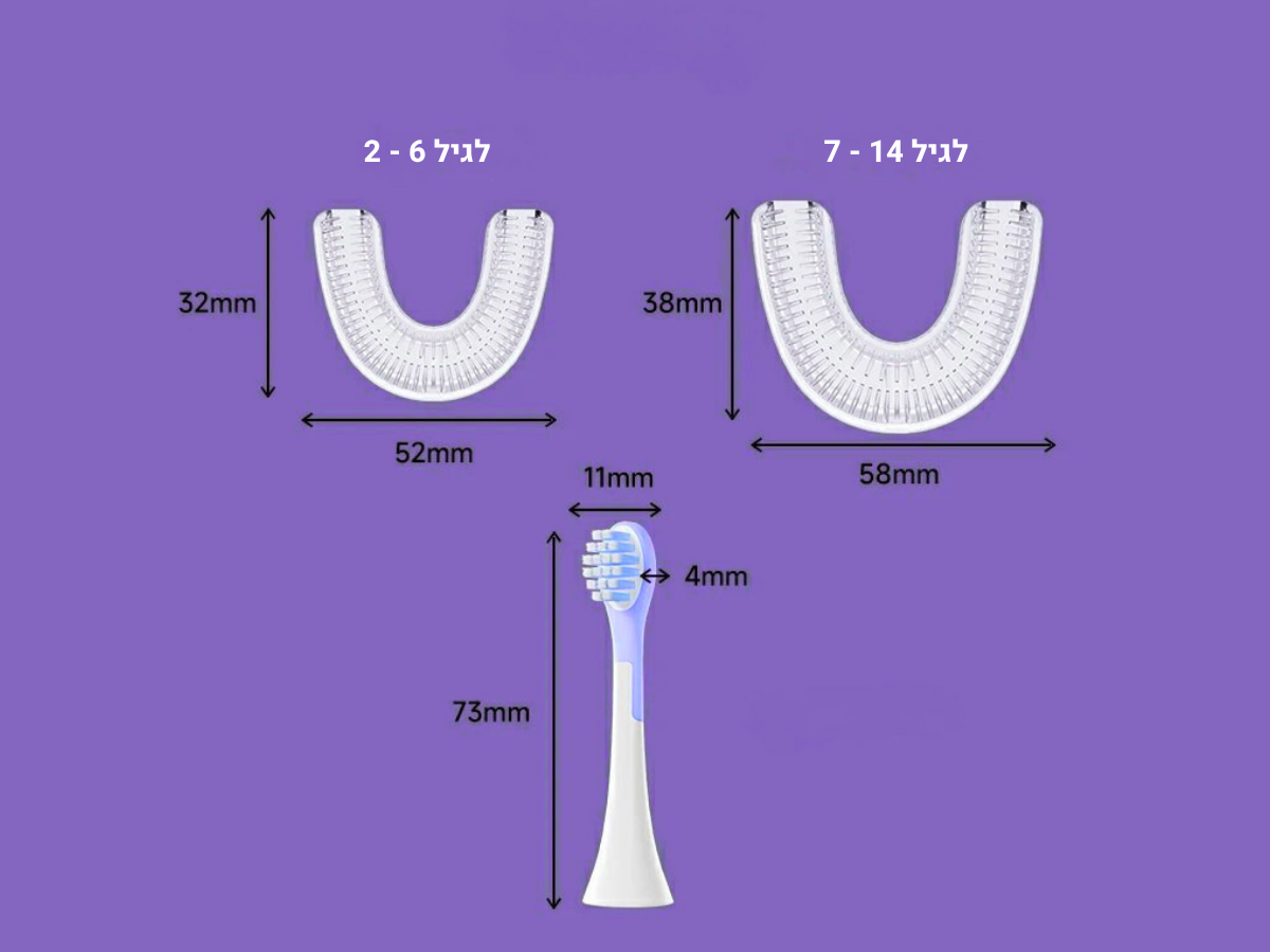 המברשות שיניים שלנו מתאימות לגילאי 2 עד 14. הסט מגיע עם שני ראשים – ראש U רך במיוחד לגילאים צעירים, וראש רגיל לצחצוח מסורתי.